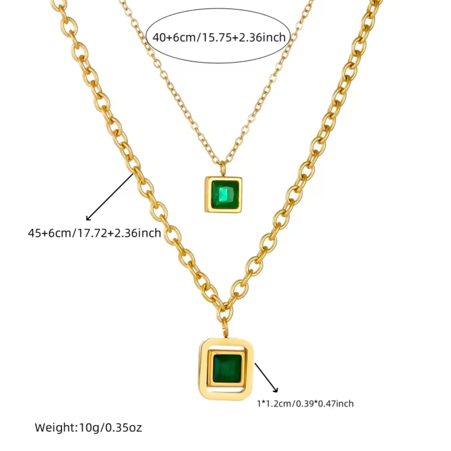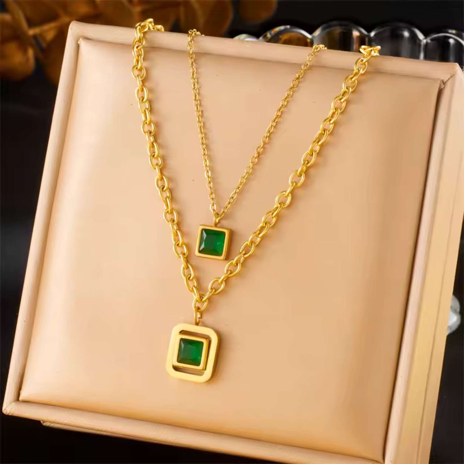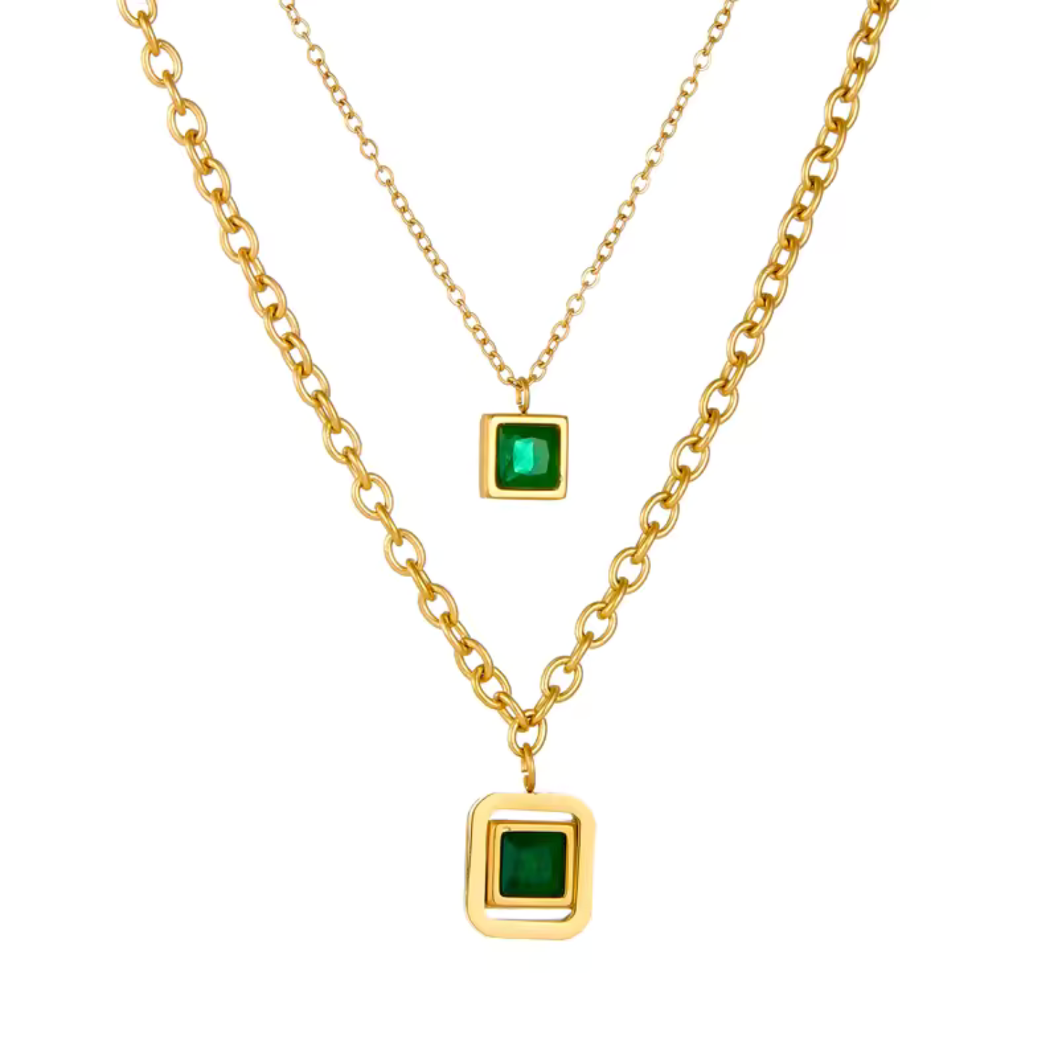 The Nyra Valemire Necklace captures attention with its striking square-cut green zircon, set on a polished gold chain. Its clean lines and radiant gemstone create a balance between boldness and grace, making it an eye-catching piece that elevates both day and evening looks.
